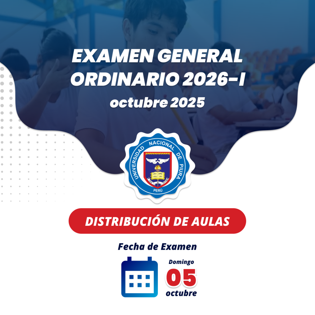 Conectando tu CAMPUS CON EL MUNDO 02 de octubre 2025 Listado de postulantes al Examen General Ordinario 2026 – I del 5 de octubre de 2025 La Universidad Nacional de Piura comunica a la comunidad universitaria y al público en general que ya se encuentra disponible el listado oficial de postulantes inscritos para rendir el Examen General Ordinario, a realizarse este domingo 5 de octubre de 2025. Se exhorta a los postulantes a verificar con anticipación su inscripción en el listado publicado en los canales oficiales, acudir puntualmente el día del examen y portar su Documento Nacional de Identidad (DNI), así como los útiles permitidos por la Oficina Central de Admisión. LISTADO DE POSTULANTES – EXAMEN ORDINADIO 2026-I OCTUBRE 2025 NOTICIAS RECIENTES RATIFICACIÓN Y PROMOCIÓN DOCENTE 8 de septiembre de 2025 RESULTADOS SEGUNDO EXAMEN IDEPUNP ABRIL-JULIO 2025 20 de julio de 2025 Distribución de aulas para el segundo examen IDEPUNP abril – julio 2025 18 de julio de 2025 Universidad Nacional de Piura paraliza labores académicas y administrativas debido a elecciones de rector 7 de julio de 2025 RESULTADOS PRIMER EXAMEN IDEPUNP ABRIL-JULIO 2025 22 de junio de 2025 Comunicado a la opinión pública 17 de junio de 2025
