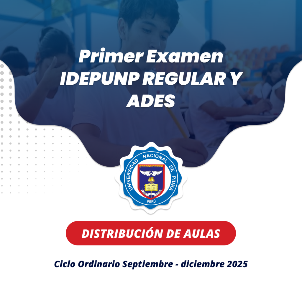Conectando tu CAMPUS CON EL MUNDO 06 de noviembre 2025 Distribución de aulas para el primer examen de IDEPUNP REGULAR Y ADES – CICLO ORDINARIO SEPTIEMBRE – DICIEMBRE 2025 El Instituto de Enseñanza Preuniversitaria de la Universidad Nacional de Piura (IDEPUNP) comunica a los postulantes del Primer Examen IDEPUNP REGULAR Y ADES – Ciclo Ordinario Septiembre – diciembre 2025 que ya está disponible la distribución oficial de aulas para este 09 de noviembre. Se exhorta a los postulantes a consultar su aula asignada con anticipación, presentarse puntualmente el día del examen y portar su DNI y útiles permitidos. Listado de postulantes NOTICIAS RECIENTES RESULTADOS FINALES DE PROCESO DE ASCENSO DE PERSONAL ADMINISTRATIVO 7 de noviembre de 2025 Convocatoria – Proceso de Nombramiento 2025 8 de octubre de 2025 Listado de postulantes al Examen General Ordinario 2026 – I del 5 de octubre de 2025 2 de octubre de 2025 RATIFICACIÓN Y PROMOCIÓN DOCENTE 8 de septiembre de 2025 RESULTADOS SEGUNDO EXAMEN IDEPUNP ABRIL-JULIO 2025 20 de julio de 2025 Distribución de aulas para el segundo examen IDEPUNP abril – julio 2025 18 de julio de 2025
