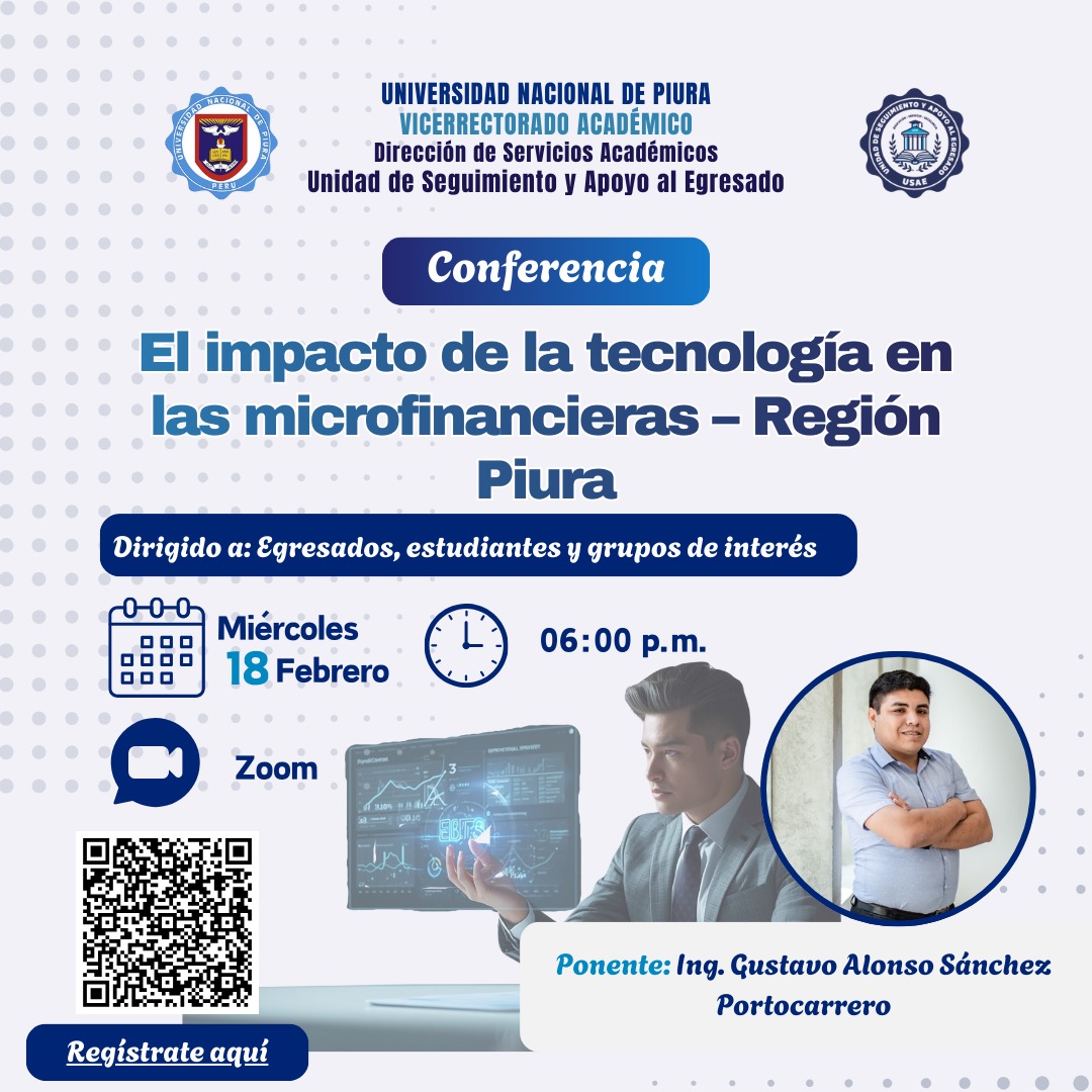 La Unidad de Seguimiento y Apoyo al Egresado – UNP, invita a participar de la Conferencia: «El impacto de las tecnologías en las microfinancieras – Región Piura».
